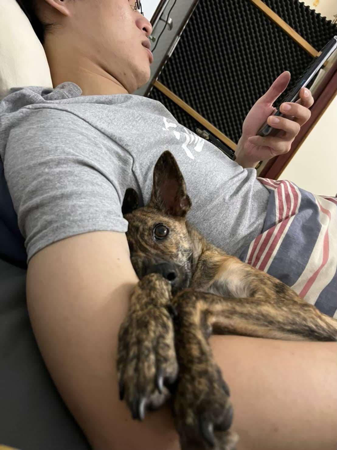 大概三、四個月大,他看起來髒髒的,非常膽小、害怕的樣子。飼養員把他抱出來交到我手上的時候,感覺像一坨臭臭、熱熱的香菇貢丸,他好像很緊張,我讓太太也抱一下他。大概是天氣熱的關係,我第一時間沒有注意到,總之他在我身上挫了一身的屎,拉稀的那種,還是溫的,我看了一下太太身上也都是他的大便。